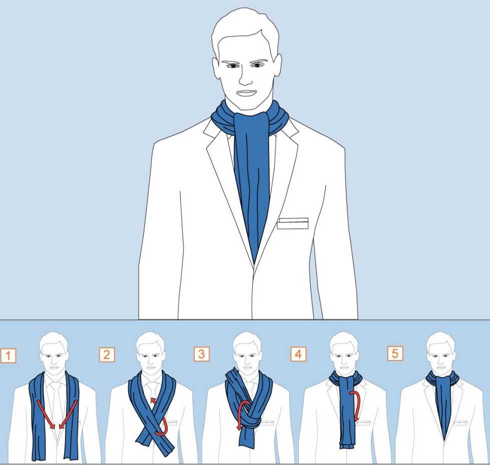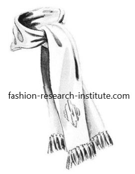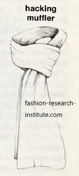 And when a wealthy sportsman went off to ski at St. Moritz, his ski outfit inevitably included a muffler of a brightly colored knit or cashmere, and it was the fashion to wear it twisted over the left shoulder, with one end hanging down the back and the other down the front. 裕福なスポーツ愛好家がサンモリッツへスキーに出かける際、そのスキーウェアには必ず鮮やかな色のニットやカシミヤのマフラーが組み込まれており、左肩で交差し、一方の端を背中側へ、もう一方の端を前に垂らすスタイルが流行していた。